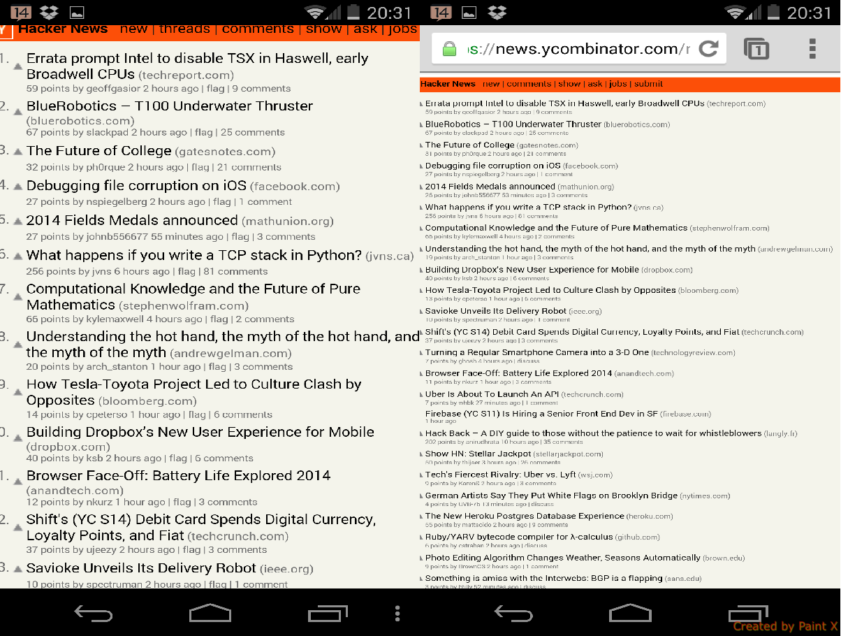 I started off with Dolphin and, for a time, everything was peachy. Then web pages started to become more complex and the poor Dolphin started crashing on some of them. It was then that I installed Chrome and decided to start using it as my primary mobile browser. It wasn’t bad, but as soon as I visited a text heavy, not mobile optimised, web page, such as HackerNews, things went completely tits-up. Chrome simply can’t re-flow the text so it would be readable. Just look at the comparison between Dolphin (which rocks in this area) and Chrome: